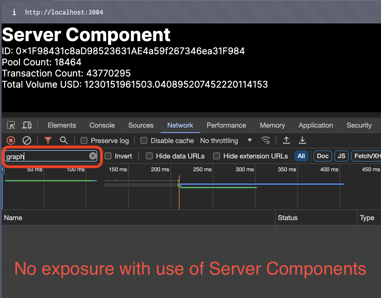 1const API_KEY = process.env.API_KEY23export default async function ServerComponent() {4 const response = await fetch(5 `https://gateway-arbitrum.network.thegraph.com/api/${API_KEY}/subgraphs/id/HUZDsRpEVP2AvzDCyzDHtdc64dyDxx8FQjzsmqSg4H3B`,6 {7 method: 'POST',8 headers: {9 'Content-Type': 'application/json',10 },11 body: JSON.stringify({12 query: /* GraphQL */ `13 {14 factories(first: 5) {15 id16 poolCount17 txCount18 totalVolumeUSD19 }20 }21 `,22 }),23 },24 )2526 const responseData = await response.json()27 const data = responseData.data2829 return (30 <div>31 <h1>Server Component</h1>32 {data ? (33 <ul>34 {data.factories.map((factory) => (35 <li key={factory.id}>36 <p>ID: {factory.id}</p>37 <p>Pool Count: {factory.poolCount}</p>38 <p>Transaction Count: {factory.txCount}</p>39 <p>Total Volume USD: {factory.totalVolumeUSD}</p>40 </li>41 ))}42 </ul>43 ) : (44 <p>Loading data...</p>45 )}46 </div>47 )48}Step 4: Use the Server Component