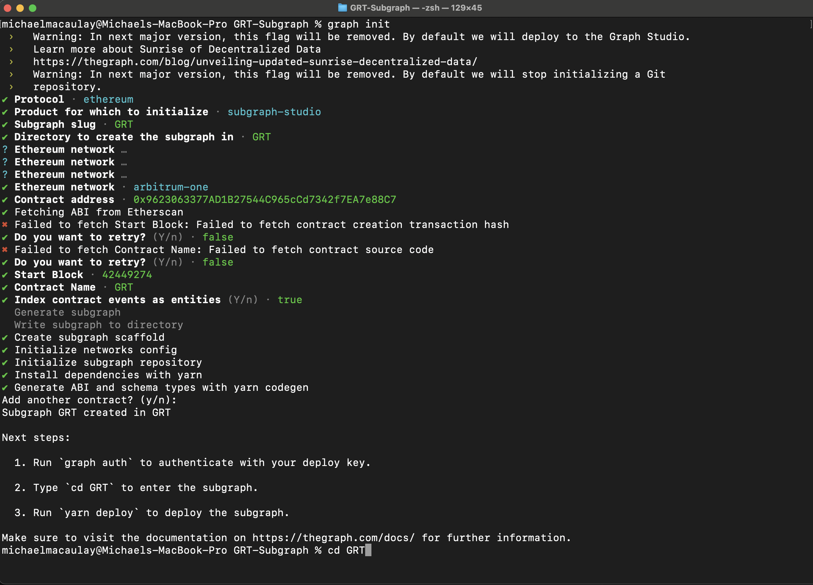 See the following screenshot for an example of what to expect when initializing your Subgraph: