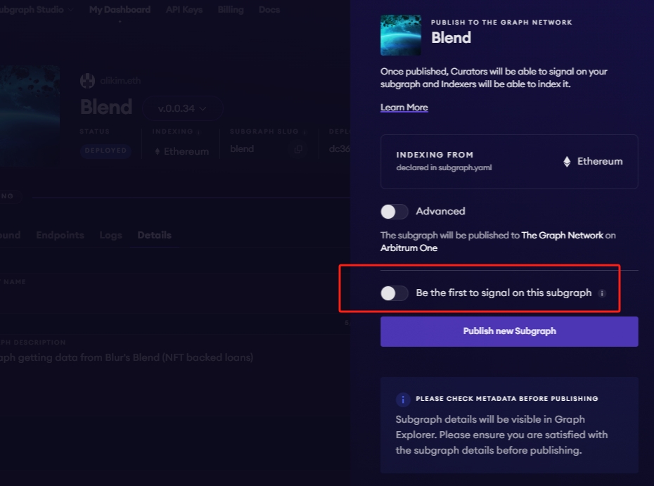 graph codegen && graph buildthengraph publish. - A browser window will prompt you to connect your wallet, add metadata, and publish your Subgraph to the network of your choice.