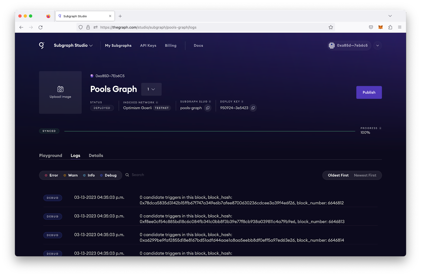 Check the logs on the dashboard to see if there are any errors with your Subgraph. The logs of an operational Subgraph will look like this: